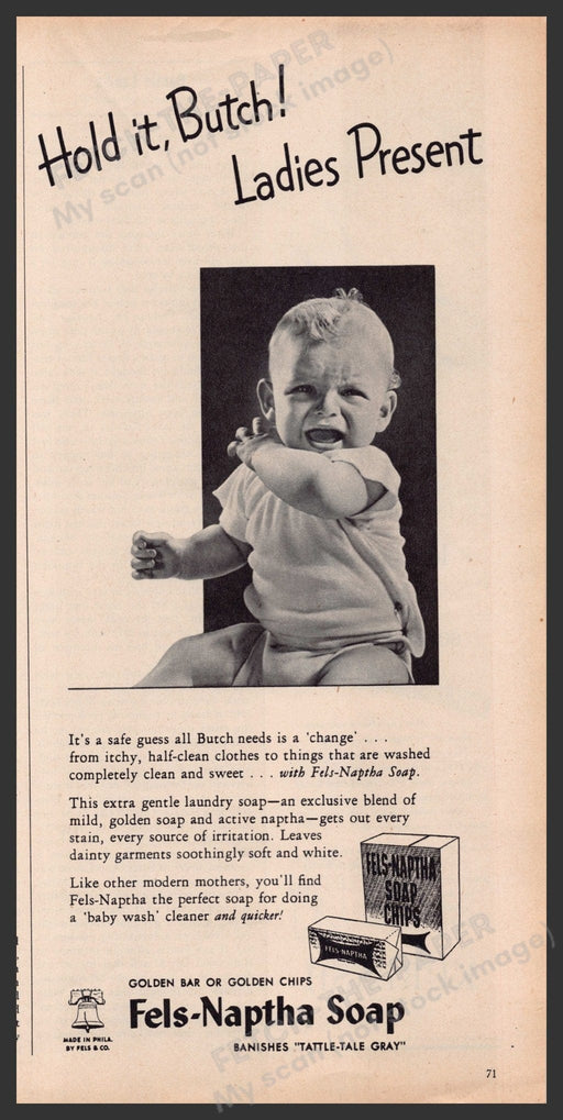 This vintage 1948 Fels-Naptha Laundry Soap advertisement features a crying baby, highlighting the soap's effectiveness in cleaning and soothing irr...