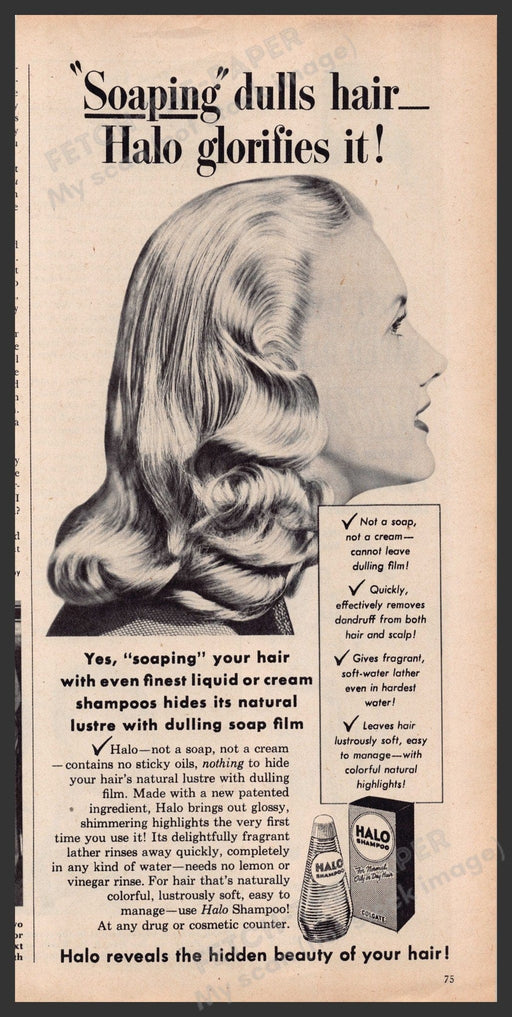 Print Advertisement1948Halo ShampooMeasures approximately 5.25" x 11.25" Print advertisement only, not the featured product Original advertisemen...
