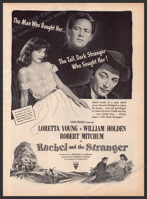This is a captivating print advertisement from the 1940s for the movie release of "Rachel and the Stranger" in 1948. The ad features striking black...