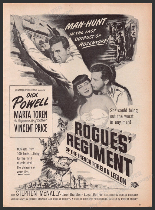 This vintage 1948 print advertisement showcases the thrilling movie release "Rogues' Regiment" starring Dick Powell, Marta Toren, and Vincent Price...