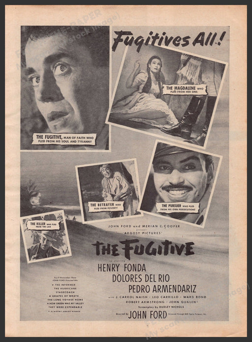 This is a vintage 1947 print advertisement for the movie release of "The Fugitive" featuring Henry Fonda. The ad captures the essence of the 1940s ...