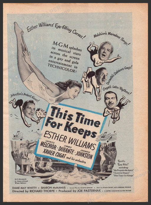 This vintage 1947 print advertisement showcases the movie "The Time For Keeps," featuring Esther Williams. The ad highlights the film's vibrant Tec...