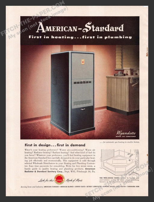This original 1940s American-Standard Wyandotte print advertisement showcases the innovative heating solutions of the era. The ad features a sleek,...
