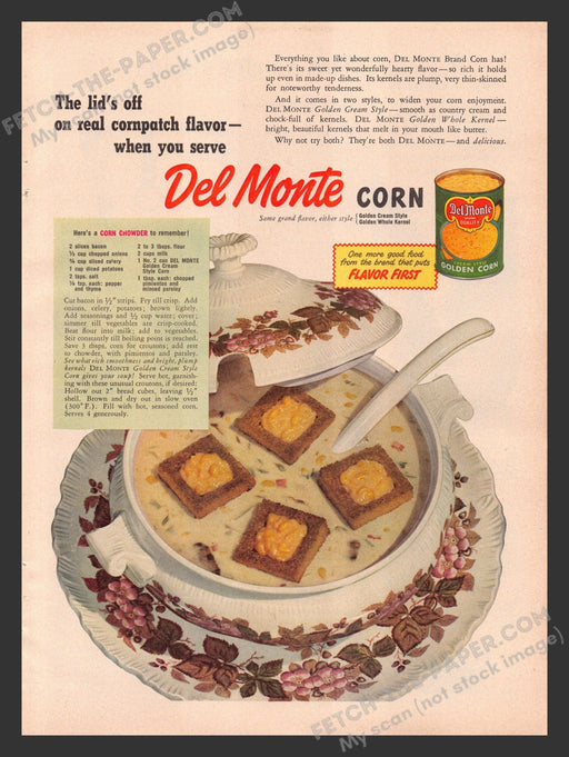 Del Monte Corn Chowder Recipe 1940s Print Advertisement