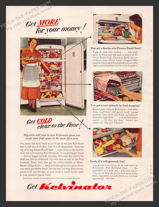 This 1940s Kelvinator Refrigerator advertisement showcases the innovative features of the era's refrigeration technology. The ad highlights a house...