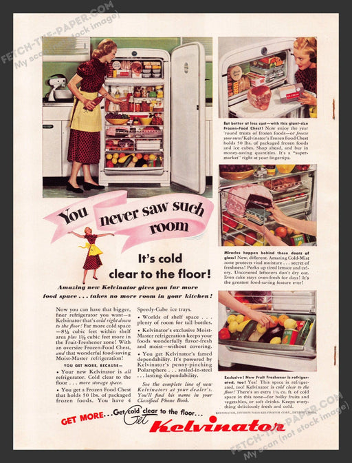 This vintage 1940s Kelvinator Roomy Refrigerator advertisement showcases a classic kitchen scene from the era. A woman in a polka-dot dress and apr...