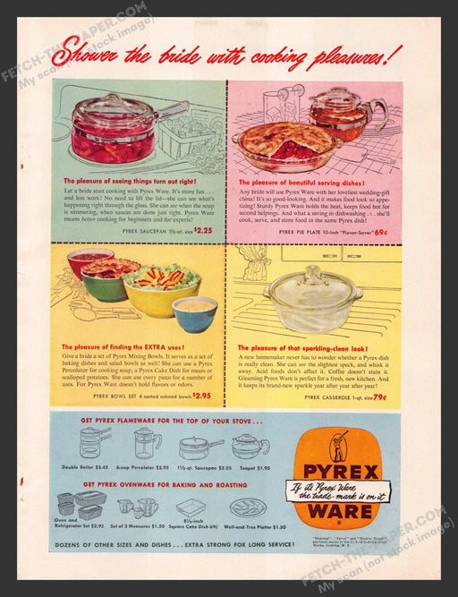 This vibrant 1940s Pyrex Ware Glass Bowls print advertisement showcases a variety of Pyrex kitchenware, perfect for the bride-to-be. The ad feature...