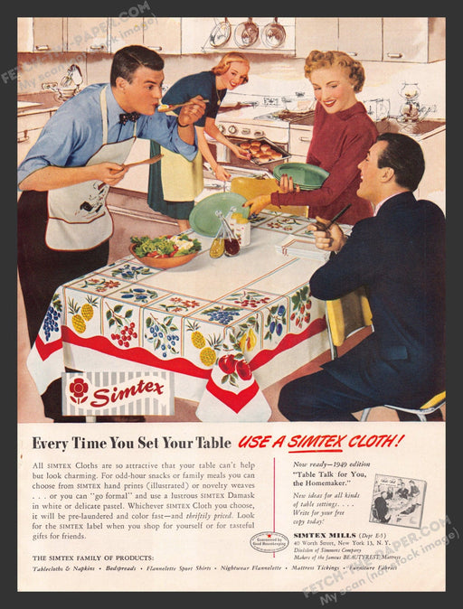 This vibrant 1940s Simtex Cloths Linen "Fruit" Design print advertisement showcases a lively family scene in a classic mid-century kitchen. The ad ...