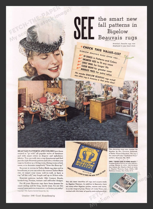 This original 1940 print advertisement showcases the elegant and stylish Bigelow Beauvais rugs. The ad features a beautifully decorated living room...