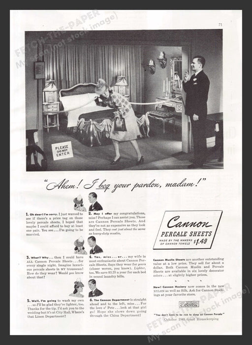 This charming 1940s advertisement for Cannon Percale Sheets showcases a playful interaction in an elegant bedroom showroom. The scene features a wo...