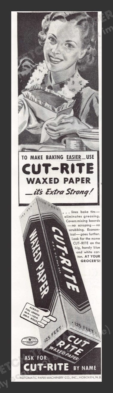 This vintage 1941 advertisement for Cut-Rite Waxed Paper showcases a woman making bread, capturing the essence of the 1940s. The ad highlights the ...