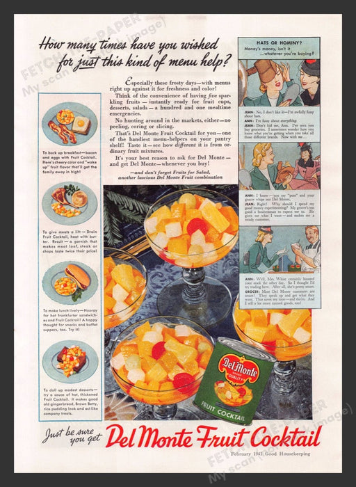 Del Monte Fruit Cocktail Hats or Hominy? 1940s Print Advertisement Ad 1941