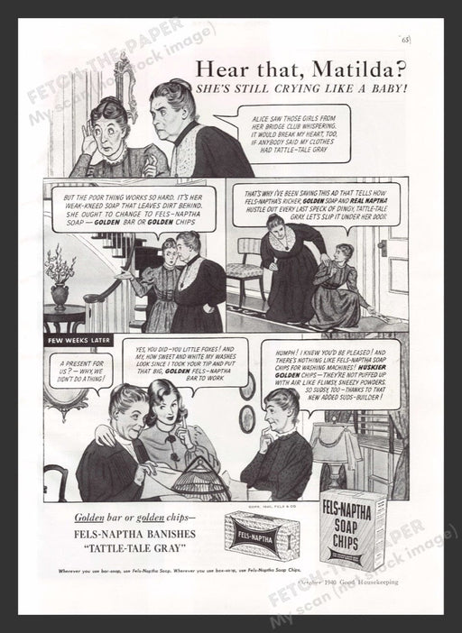 Fels-Naptha Soap Chips 1940s Print Advertisement 1940 "Tattle-Tale Gray" Cartoon