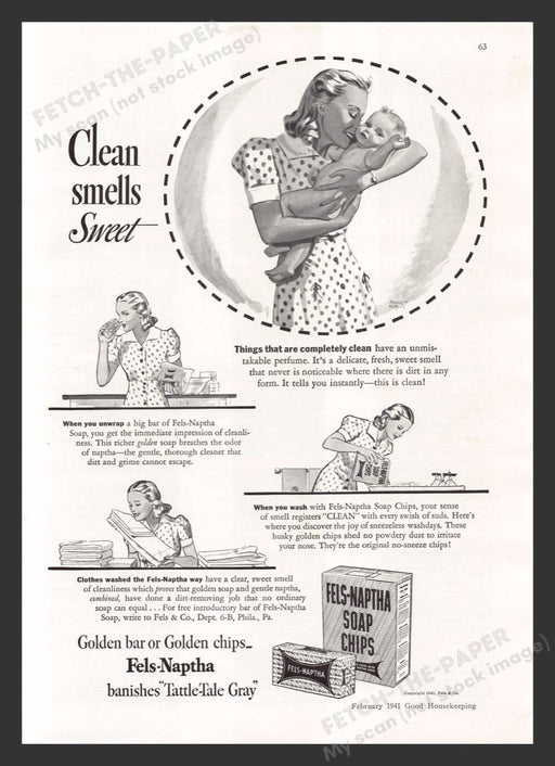 This vintage 1941 print advertisement for Fels-Naptha Soap Chips showcases a heartwarming scene of a mother lovingly holding her baby, emphasizing ...