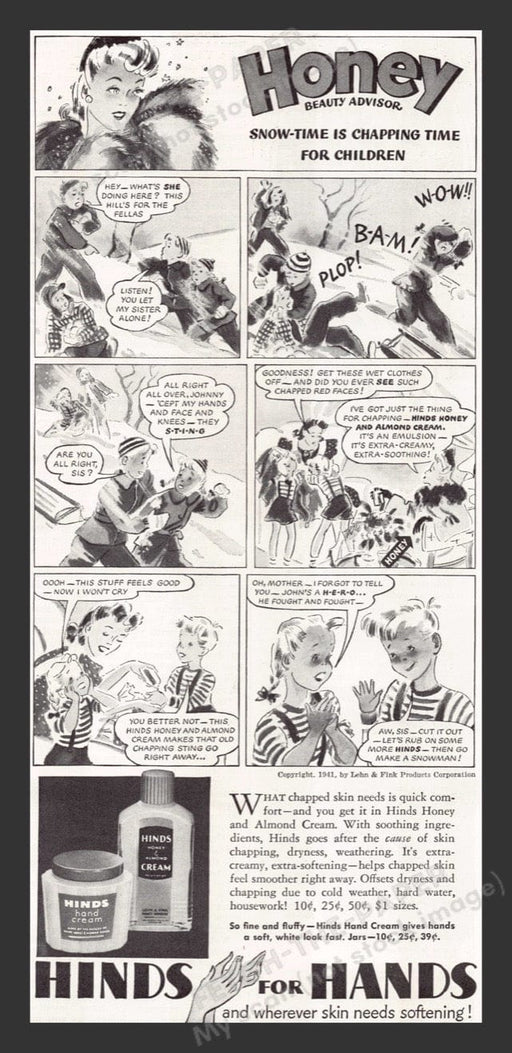 Print advertisement1941Hinds Hand Cream Honey Beauty AdvisorMeasures approximately 5" x 10" Print advertisement only, not the featured product Orig...