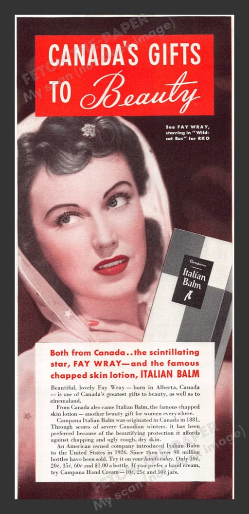 This vintage 1941 advertisement showcases Fay Wray, the celebrated actress from "Wildcat Bus," promoting Campana's Italian Balm. The ad highlights ...