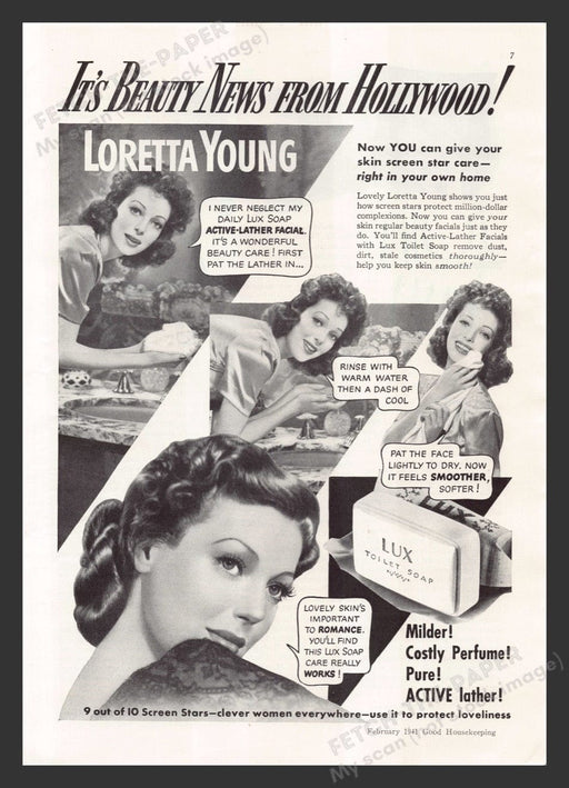 This vintage 1941 advertisement features the glamorous actress Loretta Young endorsing Lux Toilet Soap. The ad showcases her beauty routine, emphas...