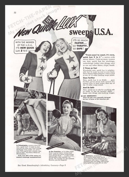 This original 1941 Quick Lux Soap Detergent print advertisement showcases the product's popularity among women across the USA. The ad features vibr...