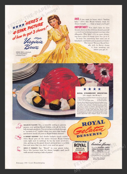 This 1941 Royal Gelatin Desserts advertisement features the glamorous Virginia Bruce, co-starring in "The Invisible Woman." The vibrant print ad ca...