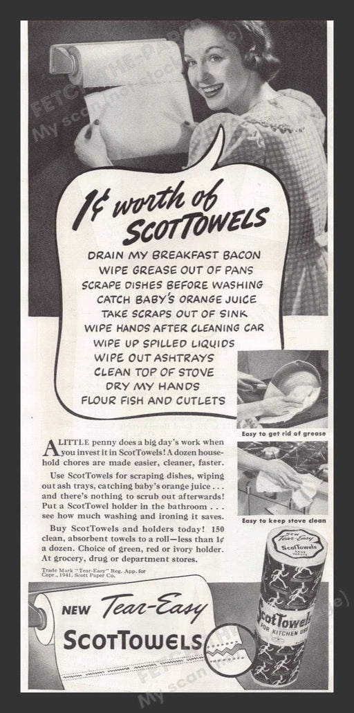 This 1941 print advertisement for Scot Towels showcases a housewife using the versatile paper towels in her kitchen. The ad highlights the various ...