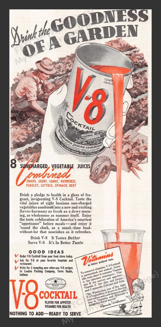 V-8 Cocktail Vegetable Juices Garden Farmer 1940s Print Advertisement Ad 1941
