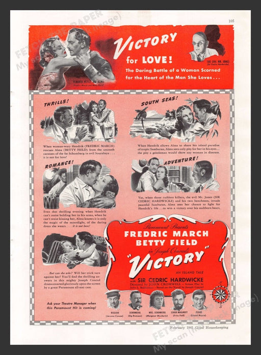 This vintage 1941 print advertisement showcases the movie "Victory," featuring Fredric March, Betty Field, and Sir Cedric Hardwicke. The ad highlig...