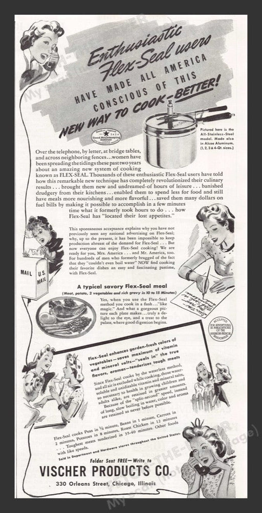 This 1940s print advertisement from Vischer Products Co. showcases the innovative Flex-Seal cooking system. The ad highlights how Flex-Seal has rev...
