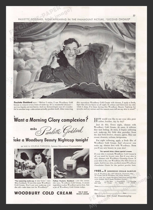 Print advertisement1941Woodbury Cold CreamPaulette Goddard (actress) "Second Chorus"Measures approximately 8" x 11" Print advertisement only, not t...