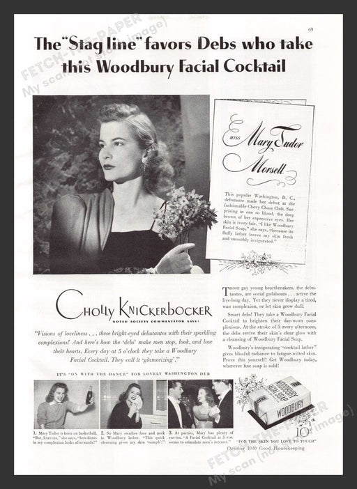 This 1940s advertisement for Woodbury Facial Soap features Miss Mary Tudor Morsell, a debutante from Washington D.C., showcasing the elegance and c...