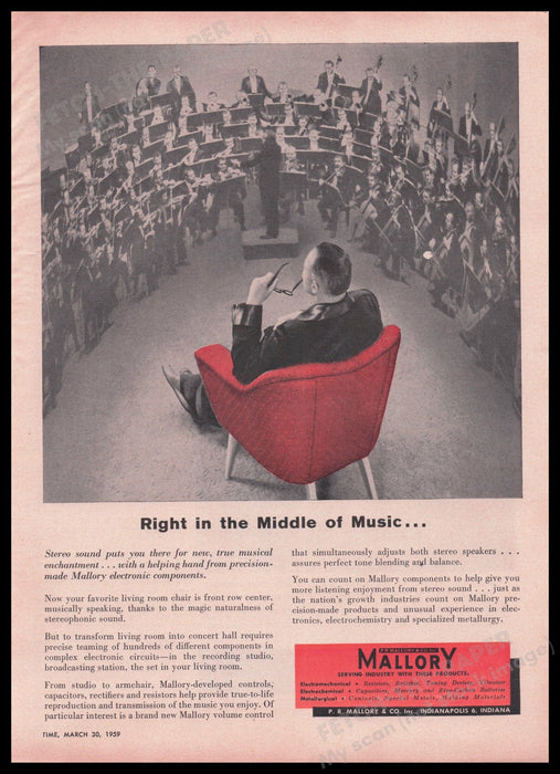 This vintage 1950s Mallory Electronic Components print advertisement from 1959 captures the essence of mid-century audio innovation. The ad features a man comfortably seated in a modern red chair, seemingly immersed in a live orchestral performance, symbolizing the superior stereo sound quality provided by Mallory's precision-made electronic components. The black-and-white imagery, combined with the vibrant red chair, highlights the era's design aesthetics and technological advancements.