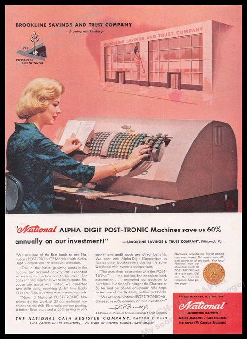 This vintage 1959 print advertisement from the National Cash Register Company showcases the innovative Alpha-Digit Post-Tronic machine. The ad features a woman operating the machine, highlighting its efficiency and cost-saving benefits for businesses like the Brookline Savings and Trust Company. The backdrop includes an image of the Brookline Savings and Trust Company building, emphasizing the trust and reliability of the brand during the 1950s.