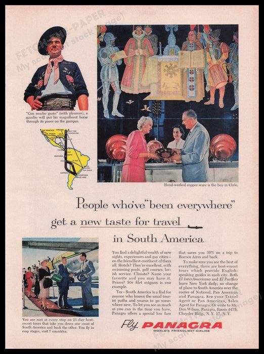This 1959 Panagra Airlines advertisement invites seasoned travelers to explore the vibrant and diverse landscapes of South America. The ad features colorful images, including a proud gaucho on the pampas, intricate hand-worked copper ware in Chile, and friendly host-escort tours that promise an unforgettable journey through seven countries. The ad highlights the excitement and cultural richness awaiting those who venture to this continent.