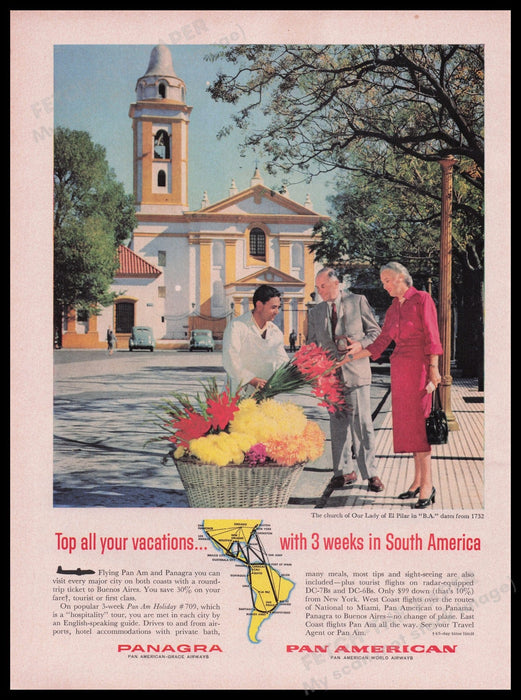 This vintage 1959 advertisement for Panagra and Pan American Airlines captures the vibrant charm of South America in the 1950s. The image features a couple engaging with a local flower vendor in front of the historic church of Our Lady of El Pilar in Buenos Aires, which dates back to 1732. The ad promotes an enticing 3-week tour package, offering travelers a chance to explore major cities on both coasts with ease and comfort.
