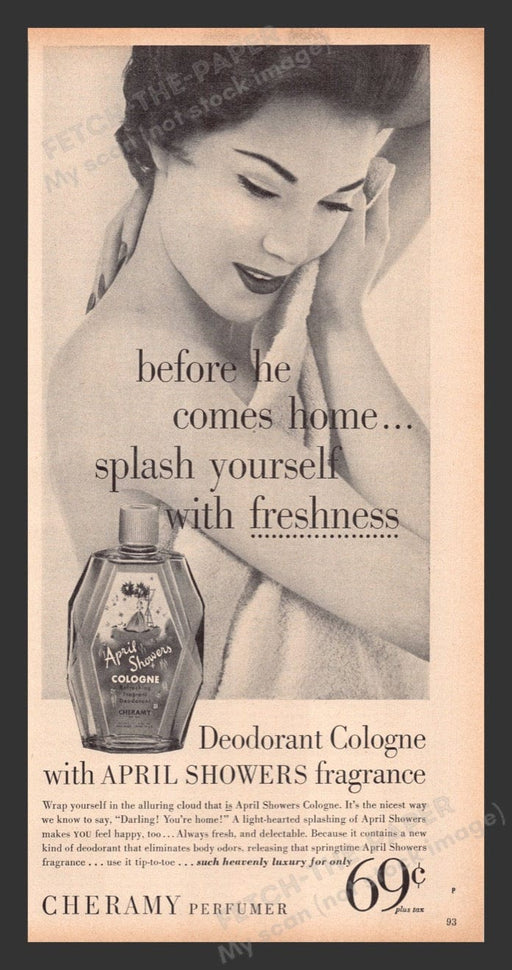This vintage 1956 advertisement for "April Showers" Deodorant Cologne by Cheramy Perfumer captures the essence of mid-20th century elegance. The bl...