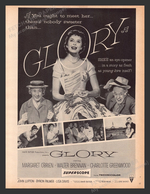 This vintage 1956 magazine print ad features the movie "Glory" starring Margaret O'Brien, Walter Brennan, and Charlotte Greenwood. The advertisemen...