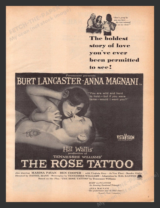 This vintage 1956 print advertisement features the iconic movie "The Rose Tattoo" starring Burt Lancaster and Anna Magnani. The ad showcases a dram...