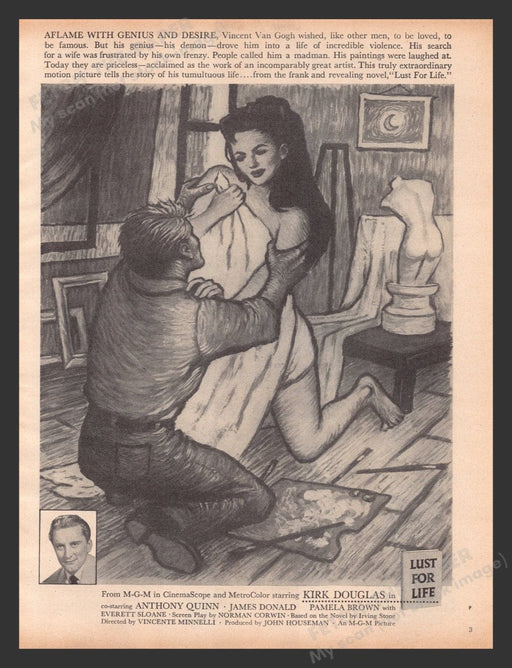 This 1956 print advertisement for the movie "Lust for Life" features a dramatic illustration capturing a scene from the film. The image depicts an ...