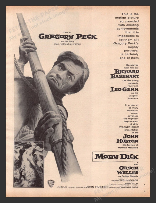 This vintage 1956 print ad showcases the classic movie "Moby Dick," featuring Gregory Peck as the fiery Captain Ahab. The advertisement highlights ...