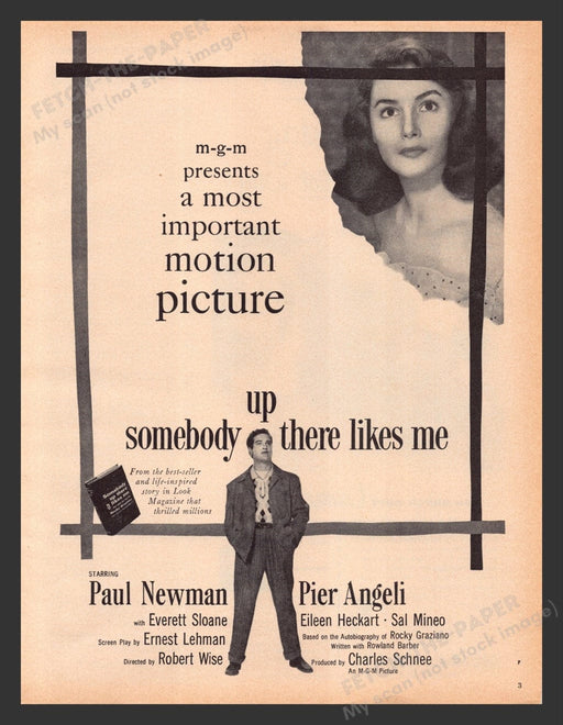This vintage 1956 print advertisement showcases the release of the movie "Somebody Up There Likes Me," featuring prominent stars such as Paul Newma...