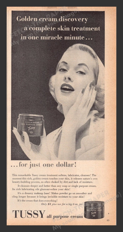 This vintage 1956 advertisement showcases Tussy All Purpose Golden Cream, a revolutionary skincare product from the 1950s. The ad features a glamor...