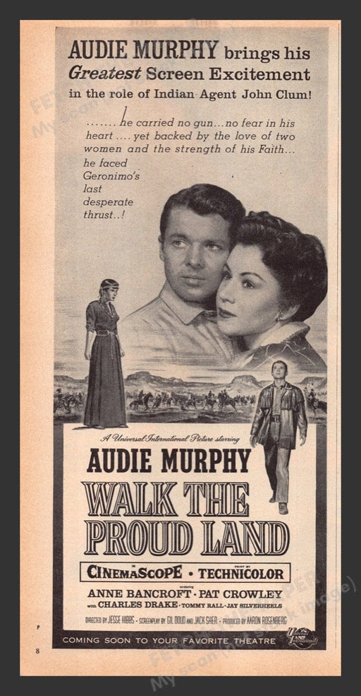 This vintage 1956 print advertisement showcases the movie "Walk the Proud Land," starring Audie Murphy, Anne Bancroft, Pat Crowley, Charles Drake, ...