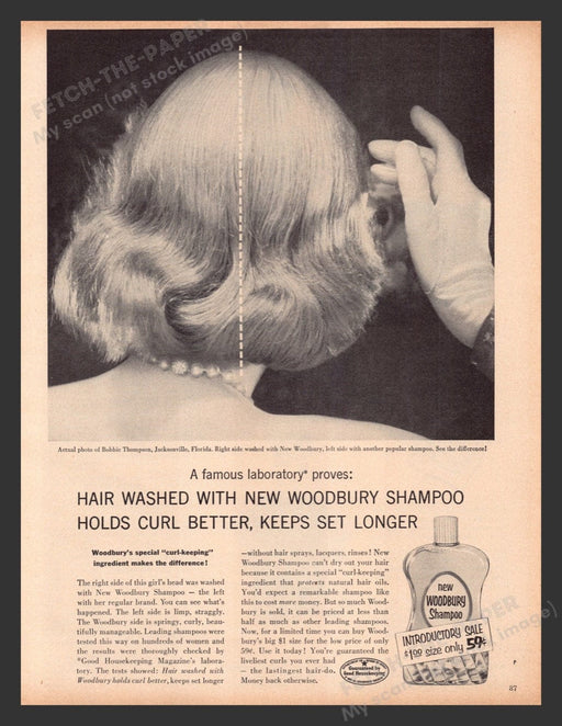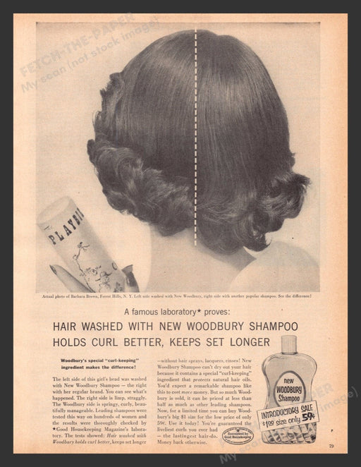 This vintage 1956 Woodbury Shampoo advertisement showcases the remarkable difference in hair quality achieved by using Woodbury Shampoo. The ad fea...