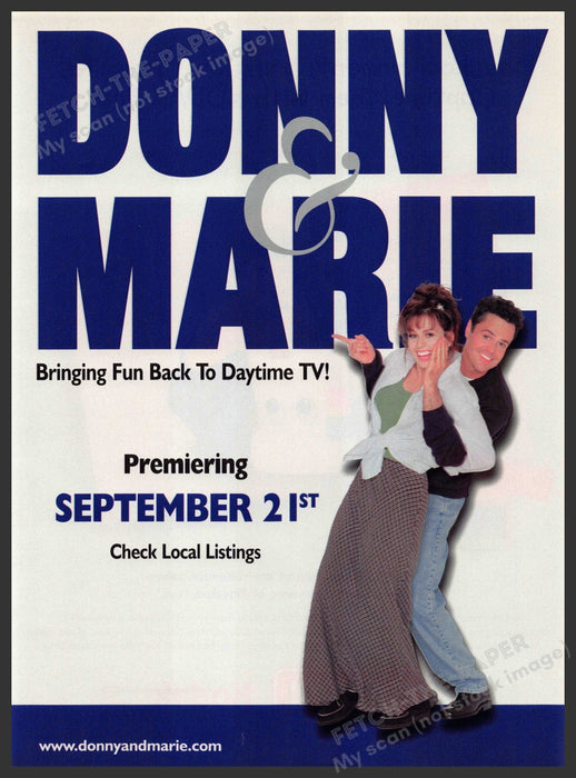This 1998 print advertisement features Donny & Marie Osmond, promoting their return to daytime television. The ad showcases the siblings in a playful pose, reflecting their dynamic and entertaining personalities that captivated audiences in the 1990s.