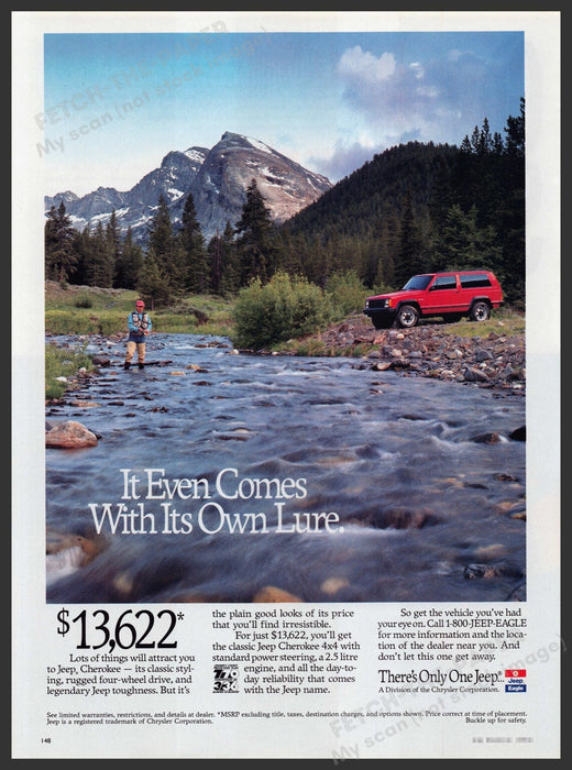 This 1993 Jeep Cherokee advertisement showcases the rugged allure of the classic SUV against a breathtaking mountainous backdrop. A fisherman stands in a clear, flowing stream, emphasizing the adventurous spirit and outdoor capability of the Jeep Cherokee. The tagline "It Even Comes With Its Own Lure" cleverly ties the vehicle's appeal to the fishing scene, highlighting its irresistible charm and practical features.