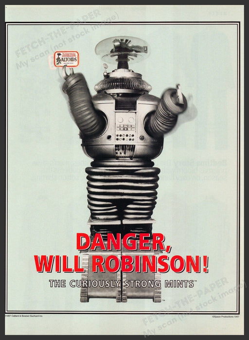 This 1998 Altoids magazine print advertisement features a nostalgic nod to the 1990s with the iconic phrase "Danger, Will Robinson!" The ad showcas...