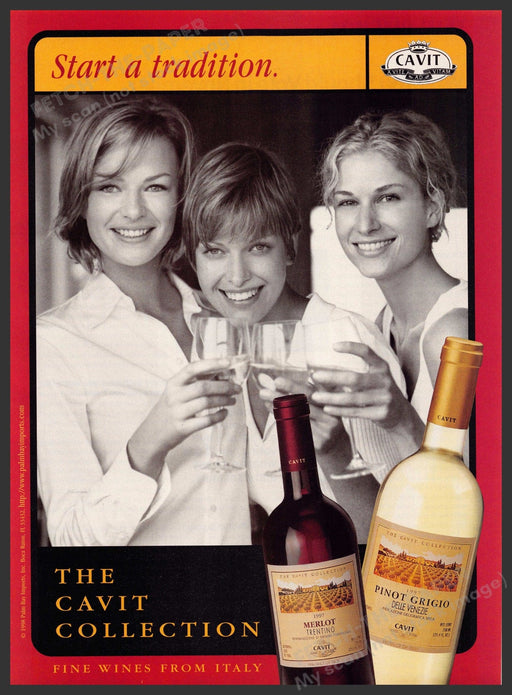 This 1998 magazine print advertisement for The Cavit Collection showcases a timeless moment of friends enjoying fine wines from Italy. The black an...