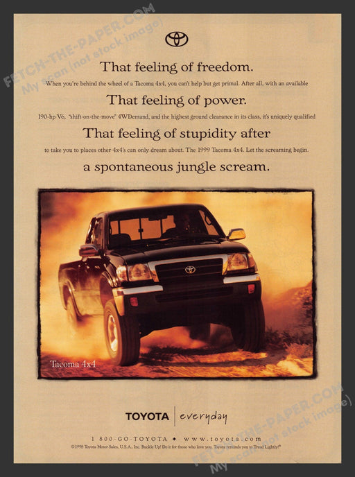 This original 1999 print advertisement for the Toyota Tacoma 4x4 truck captures the essence of adventure and power from the late 1990s. The ad show...