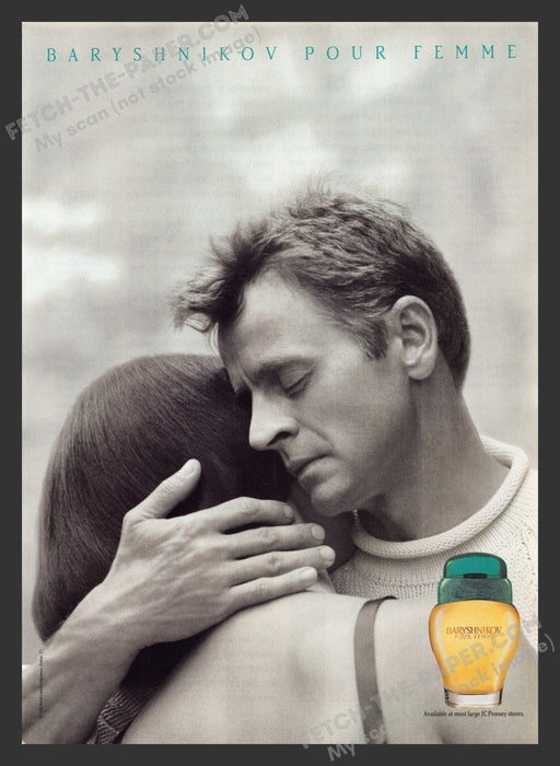 This captivating 1990s print ad for Baryshnikov for Women Perfume features an intimate black-and-white image of a man tenderly embracing a woman, e...