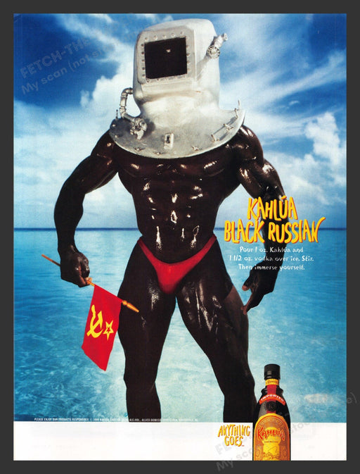 This 1999 Kahlua Black Russian print advertisement captures the essence of the 1990s with a striking image of a muscular diver standing in shallow ...