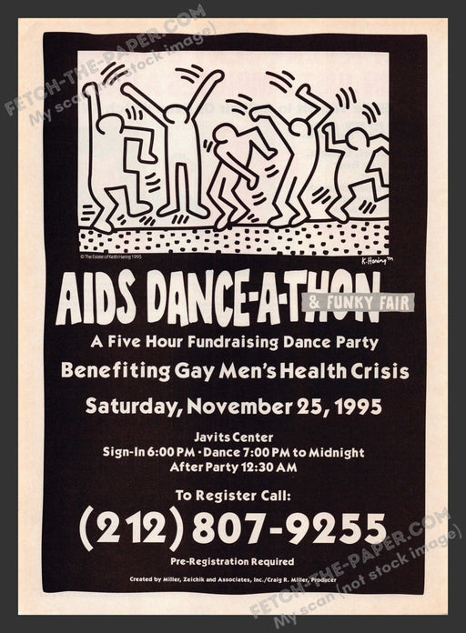 This 1995 print ad features an illustration by the renowned artist Keith Haring, promoting the AIDS Dance-a-thon & Funky Fair. The ad highlight...